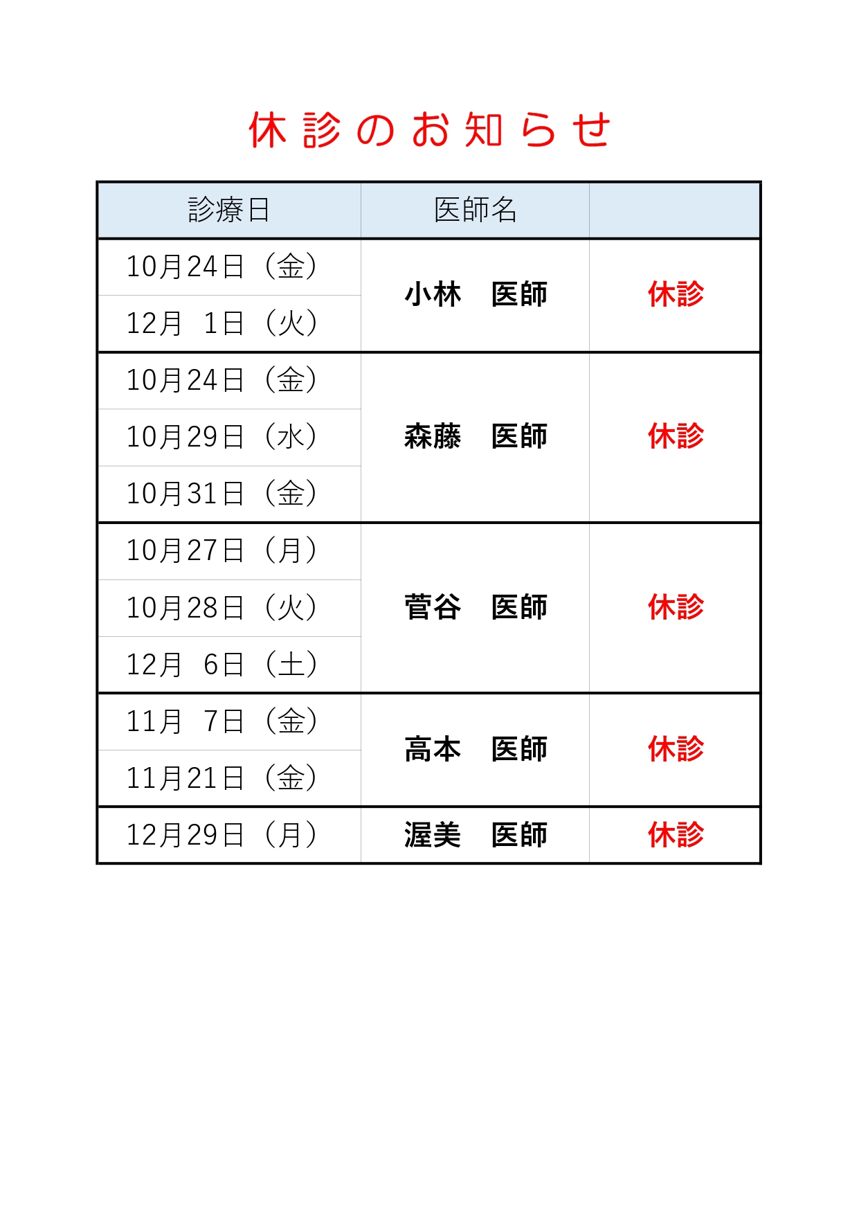 ホーム > 新着情報 > 代診情報 > 休診のお知らせ10~12月
