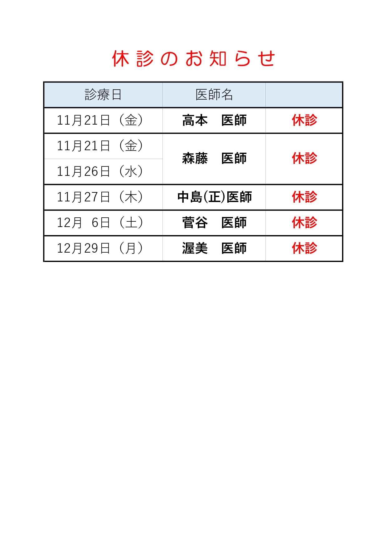 ホーム > 新着情報 > 代診情報 > 休診のお知らせ11~12月