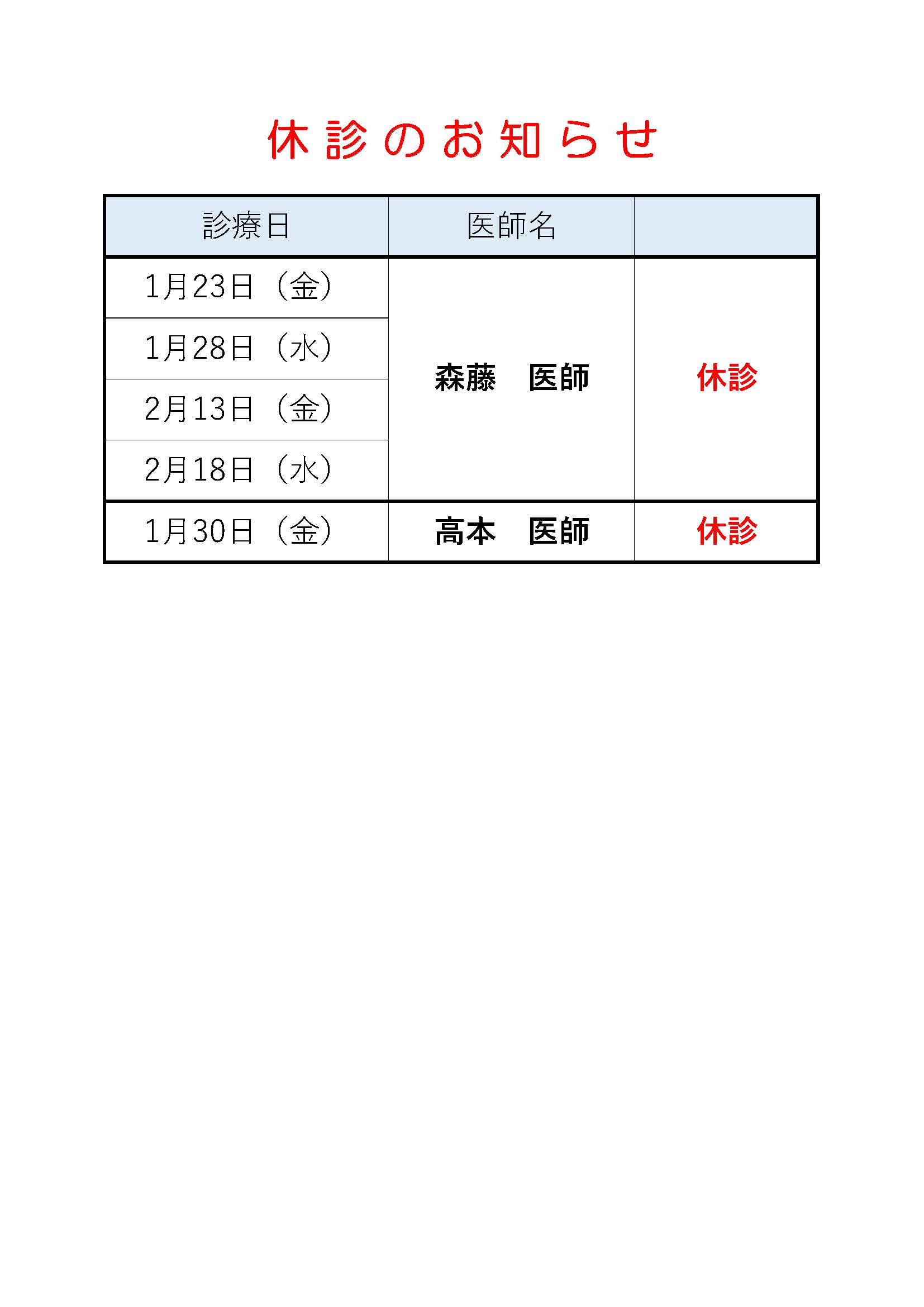 ホーム > 新着情報 > 代診情報 > 休診のお知らせ1~2月